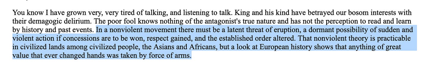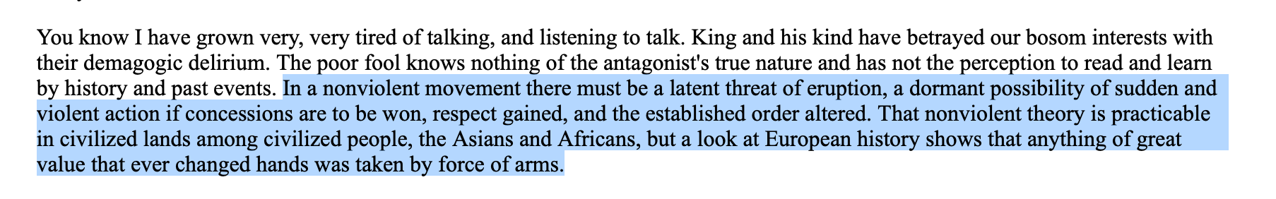 From Soledad Brother: The Prison Letters of George Jackson: “In a nonviolent movement there must be a latent threat of eruption, a dormant possibility of sudden and violent action if concessions are to be won, respect gained, and the established order altered.”