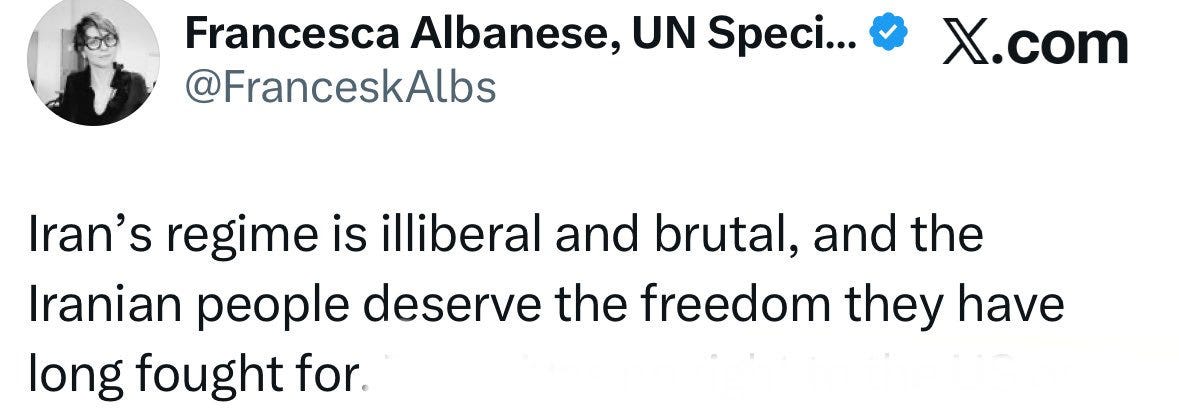 UN Special Rapporteur, Francesca Albanese, is one of many of these western influencers who condemn the Palestinian and Iranian resistance and regurgitates US imperial talking points about the leadership of Iran which they call “a regime.”